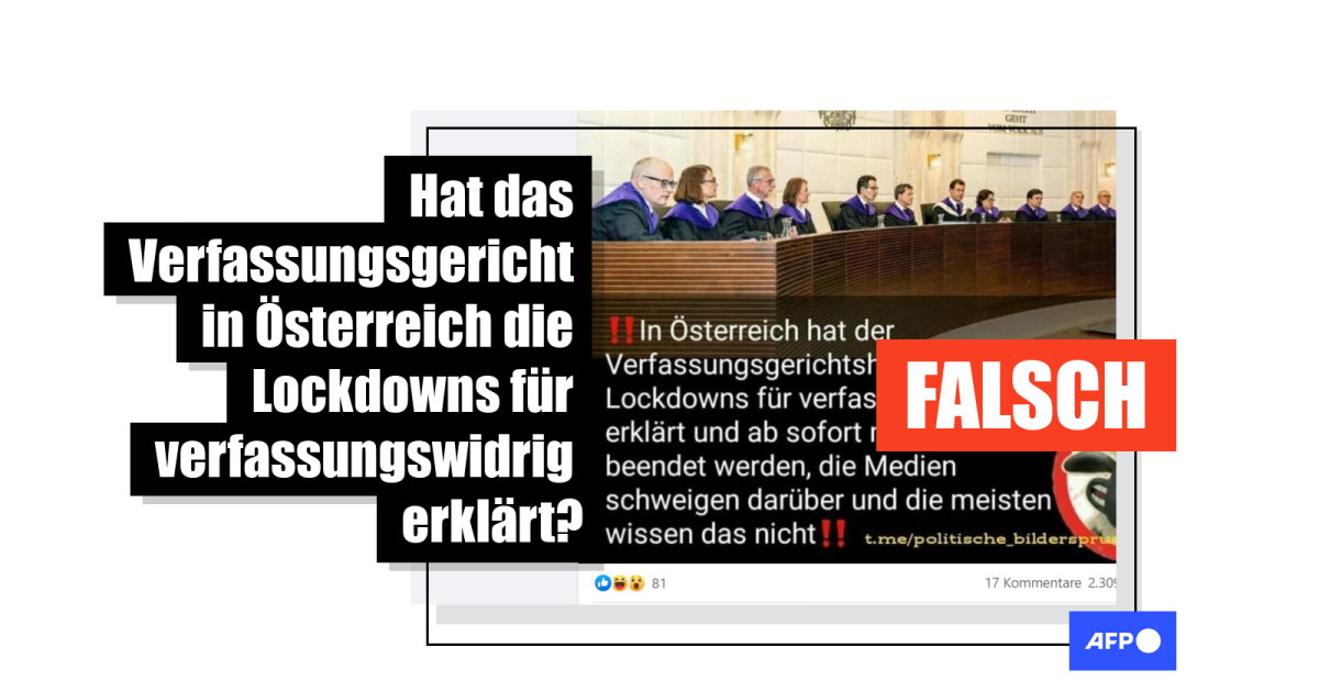 Seit Jahresbeginn teilen Tausende Facebook-User ein Text-Bild, mit dem das Ende der Lockdowns in Österreich herbeigeschrieben wird: "In Österreich hat der Verfassungsgerichtshof (VfGH) alle Lockdowns für verfassungswidrig erklärt und ab sofort muss es beendet werden, die Medien schweigen darüber und die meisten wissen das nicht", steht in den Postings (hier, hier, hier). Auch auf Telegram verbreiten User die Behauptung über die vermeintlich verfassungswidrigen Lockdowns.