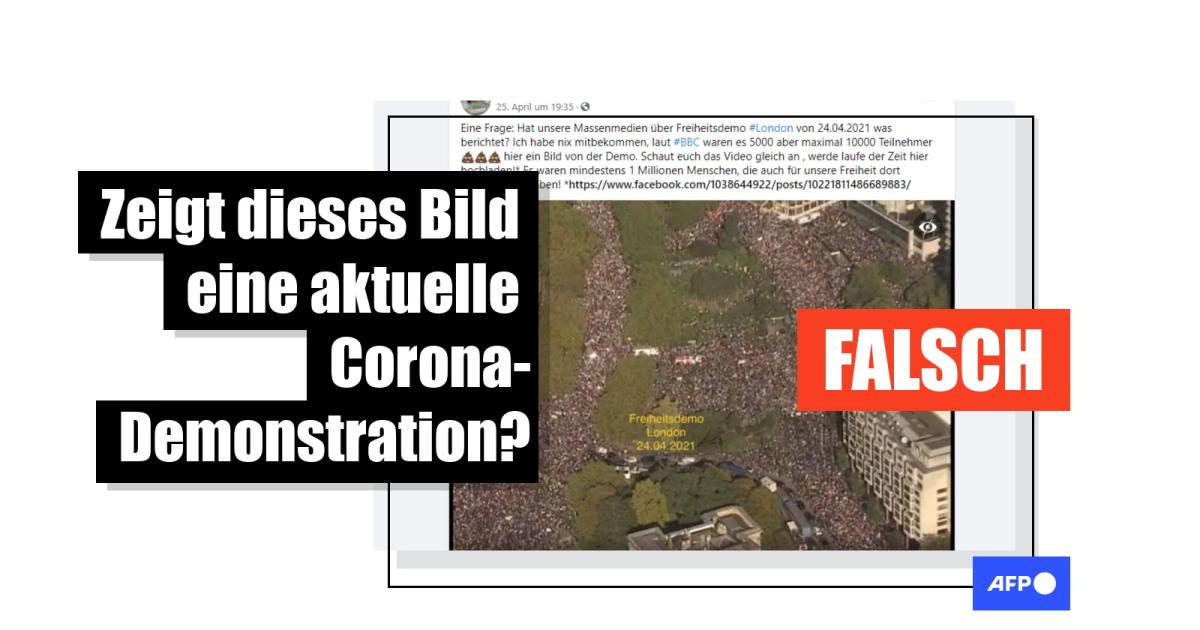 Auf einer Luftaufnahme sind zwischen Bäumen und Häusern riesige Menschenmassen in den Straßen zu sehen. Das Bild datieren Facebook-Postings auf den 24. April 2021, als in London ein als "Freiheitsdemo" bezeichneter Protest gegen Corona-Maßnahmen stattgefunden habe. Medien hätten jedoch nicht oder nur falsch über die Teilnehmerzahlen berichtet: "Hat unsere Massenmedien über Freiheitsdemo #London von 24.04.2021 was berichtet? Ich habe nix mitbekommen, laut #BBC waren es 5000 aber maximal 10000 Teilnehmer." Diesen Zahlen stellt das Posting die Luftaufnahme gegenüber, dazu heißt es: "Es waren mindestens 1 Millionen Menschen, die auch für unsere Freiheit dort demonstriert haben!"