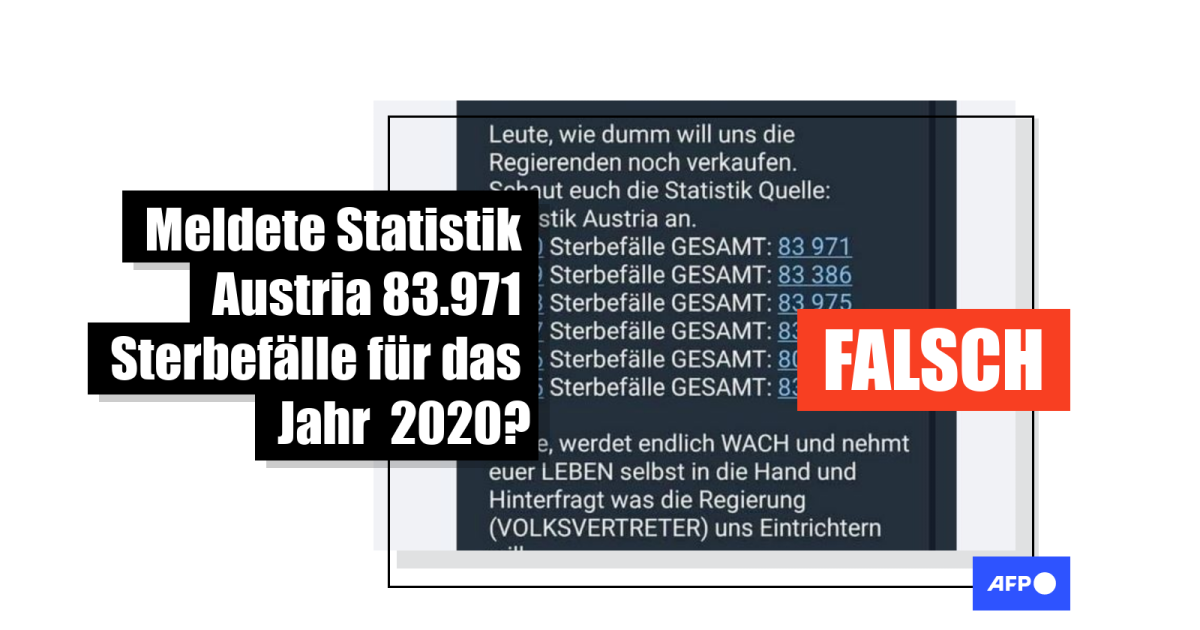 AFP suchte deshalb in der Datenbank nach aktuellen Zahlen aus dem Jahr 2020. Tatsächlich führt Statistik Austria eine weitere Tabelle, in der die Anstalt seit 2016 die Gestorbenen in Österreich pro Kalenderwoche aufführt. Zum Zeitpunkt der AFP-Recherche (6. Januar 2021) endete diese Tabelle bei Kalenderwoche 50 des Jahres 2020, also am 13. Dezember. AFP hat die bereits existierenden Zahlen zusammengezählt: Bis Mitte Dezember sind demnach bereits 85.109 Menschen gestorben – also wesentlich mehr als die auf Facebook verbreitete Zahl (83.971) vorgibt.