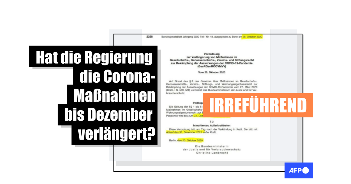 Im Screenshot von der offiziellen Verordnung des Bundesministeriums für Justiz und für Verbraucherschutz wurden einige Passagen gelb hervorgehoben: Die Worte "Verlängerung von Maßnahmen", "wird bis zum 31. Dezember 2021 verlängert" und der Ort und das Datum der Verordnung "Berlin, den 20. Oktober 2020". Daraus schlussfolgern die Facebook- und Telegram-User, dass die öffentlichen Corona-Maßnahmen bis zum 31.21.2021 verlängert worden seien. So heißt es in einem der Postings etwa: "Aber nein: Es war von Anfang an geplant, das knallharte Programm bis mindestens Ende 2021 durchzuziehen!"
