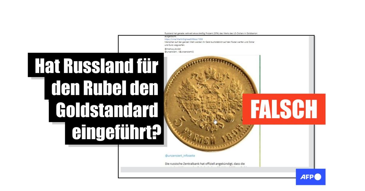Fazit: Die Behauptung, die russische Zentralbank habe die russische Währung an einen festen Goldpreis gebunden und so den Wert des US-Dollars um 30 Prozent gedrückt, ist falsch. Die Zentralbank gab lediglich an, für einen kurzen Zeitraum Gold zum Festpreis kaufen zu wollen. Finanzexperten erklärten gegenüber AFP, dass das für Zentralbanken üblich und die Behauptung falsch ist.