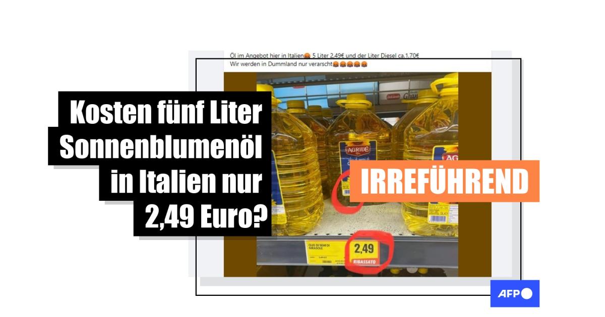 Die Behauptung: Auf dem Bild des Supermarktregals ist ein Preisschild rot hervorgehoben. Dazu heißt es, dass fünf Liter Sonnenblumenöl in Italien 2,49 Euro kosten würden und somit viel günstiger als in Deutschland seien. Ein Liter Diesel koste dort außerdem 1,70 Euro.