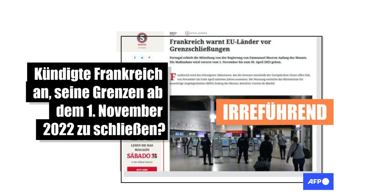 Die Behauptung: User teilen einen Screenshot der Website der portugiesischen Zeitung "Sabado" mit einer Übersetzung des betreffenden Artikels auf Deutsch. Darin heißt es, die französische Grenzschließung sei vorerst ab dem 1. November 2022 und bis zum 30. April 2023 vorgesehen. Darüber habe die Regierung von Emmanuel Macron informiert. Für diesen Zeitraum werde das Schengener Abkommen, das die Grenzen der Europäischen Union offen halte, ausgesetzt.