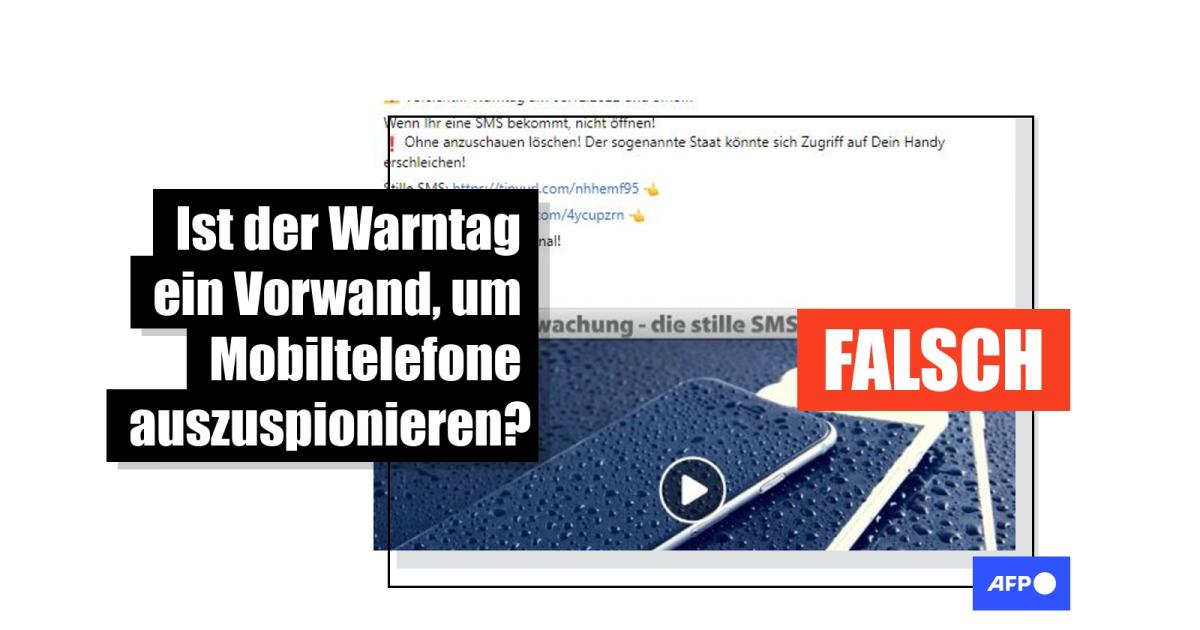 Die Behauptung: "Wenn Ihr eine SMS bekommt, nicht öffnen!", schreiben Facebook-User wenige Tage vor Durchführung einer bundesweiten Warnübung. Der Staat könne sich mithilfe der Nachricht Zugriff auf Handys "erschleichen". Zu der Behauptung wird ebenfalls ein Audio-Interview geteilt, in dem von "stillen SMS" die Rede ist, welche zur Überwachung von Mobiltelefonen genutzt werden.