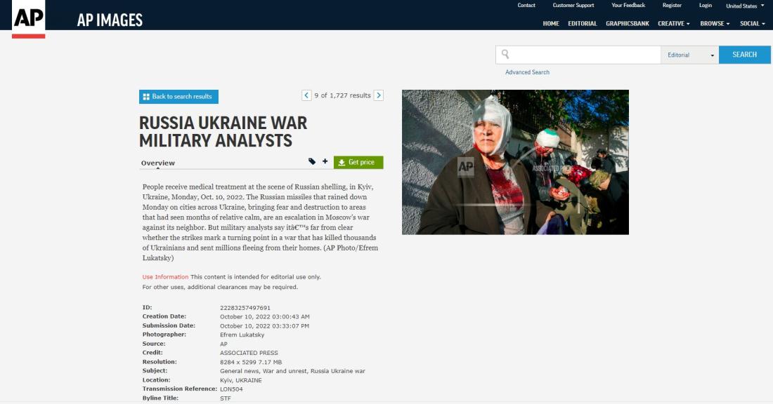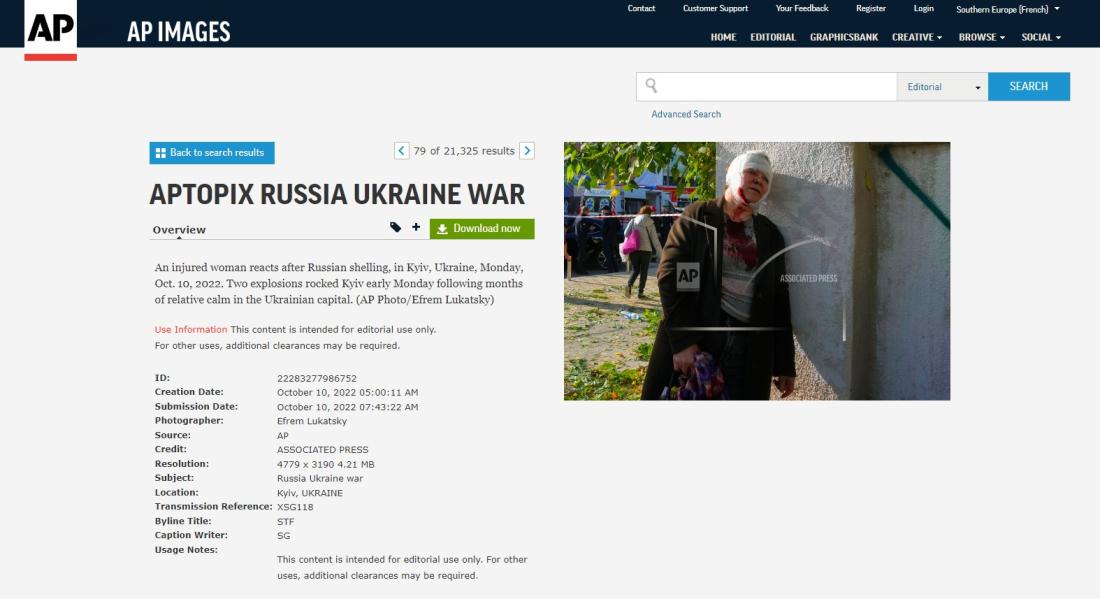 Die Nachrichtenagentur Associated Press veröffentlichte das Originalvideo am 10. Oktober 2022. Es zeigt laut Videobeschreibung "eine verletzte Frau auf der Straße mit einem Krankenwagen, umgeben von anderen verletzten Personen, der ein Mann in Uniform hilft. [...] Russland hat am Montag eine Reihe von tödlichen Angriffen gegen mehrere ukrainische Städte gestartet und dabei zivile Ziele zerstört, darunter auch das Zentrum von Kiew."