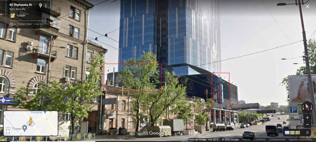 Der jetzt schwer beschädigte Wolkenkratzer Tower 101 ist auf dem auf YouTube veröffentlichten Video von Associated Press zu erkennen, genau wie auf dem Facebook-Video von Oleksandr Khomenko und auf Google Street View: