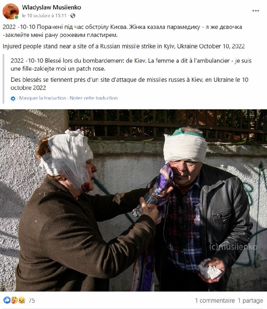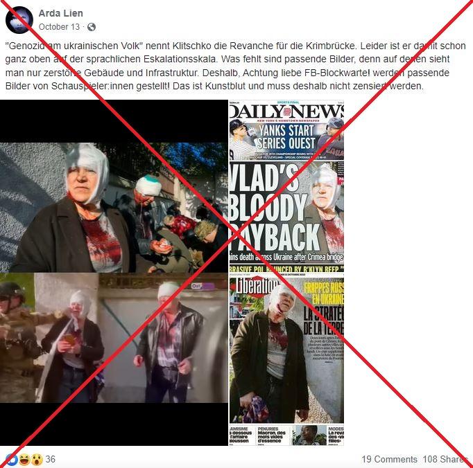 Wenige Tage nach russischen Anschlägen auf Kiew am 10. Oktober 2022, beschuldigen mehrere User in sozialen Netzwerken auf verschiedenen Sprachen die "westlichen Medien" fälschlicherweise, die Bilder einer Inszenierung zu verbreiten: auf Französisch, Spanisch, Niederländisch und Englisch. Die "Fake-Verletzten" seien lediglich geschminkte Zivilisten. Den englischen Tweet der russischen Polit-Journalistin Maria Dubovikova hatte unter anderem der russische Vize-UN-Botschafter Dmitri Poljanski geteilt. Auch auf Deutsch hatten Userinnen und User die Behauptung verbreitet, ein hundertfach geteiltes Posting hat den Beitragstext mittlerweile aber geändert.