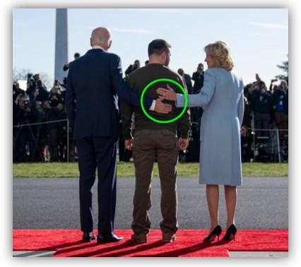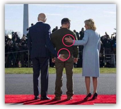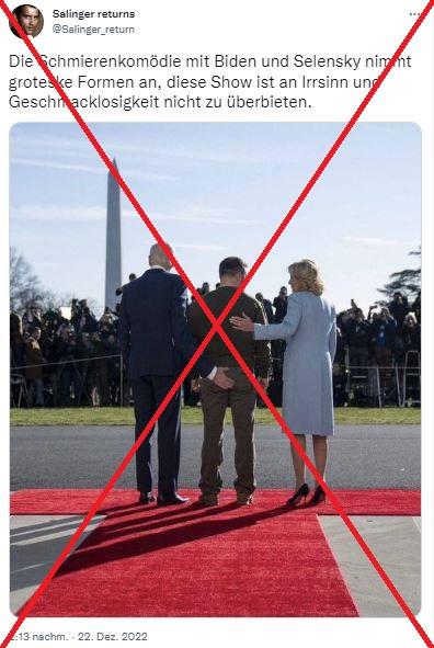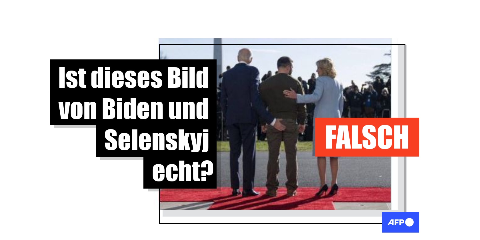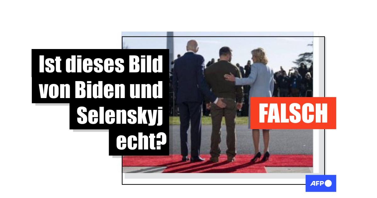 Die Behauptung: Online wird ein Foto geteilt, das den US-Präsidenten Joe Biden, den ukrainischen Präsidenten Wolodymyr Selenskyj und die First Lady Jill Biden mit dem Rücken zur Kamera zeigt. Sie stehen auf einem roten Teppich und blicken auf eine Menschenmenge. Während Jill Biden ihre Hand auf Selenskyjs Rücken legt, berührt Joe Biden allerdings mit seiner Hand dessen Gesäß.