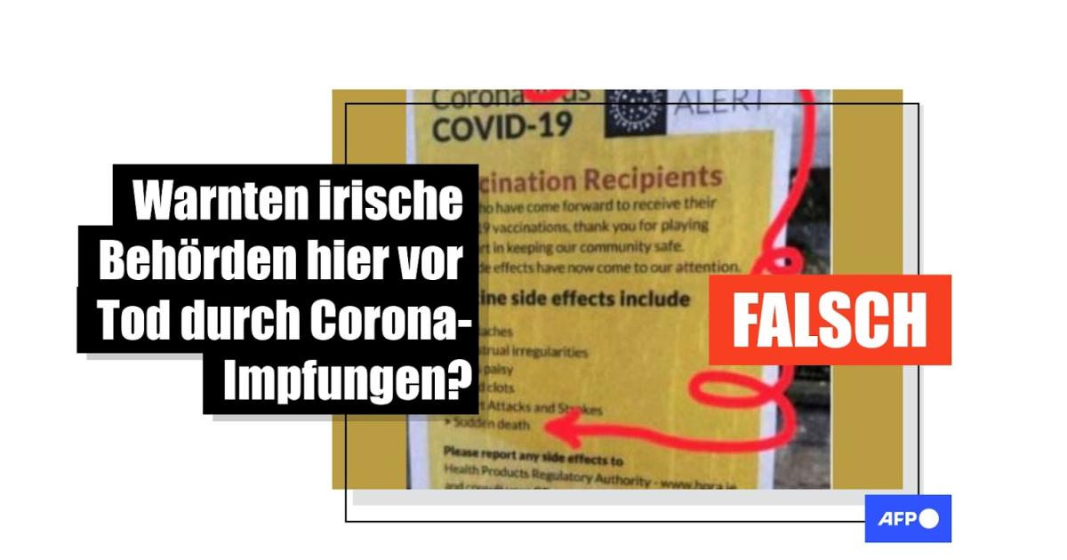 Die Behauptung: User verbreiten im Netz ein angebliches Plakat der irischen Gesundheitsbehörden zu Impfnebenwirkungen. Auf dem Poster wird unter anderem vor plötzlichen Tod gewarnt. Auch Kopfschmerzen, Menstruationsstörungen, Lähmungen, Blutgerinnsel, Herzinfarkte und Schlaganfälle werden auf dem Plakat gelistet. Es wird dazu aufgefordert, die Nebenwirkungen an die Health Products Regulatory Authority (HPRA) zu melden. In der unteren rechten Ecke ist das Logo der irischen Regierung mit den Worten "Volk von Irland" zu sehen.