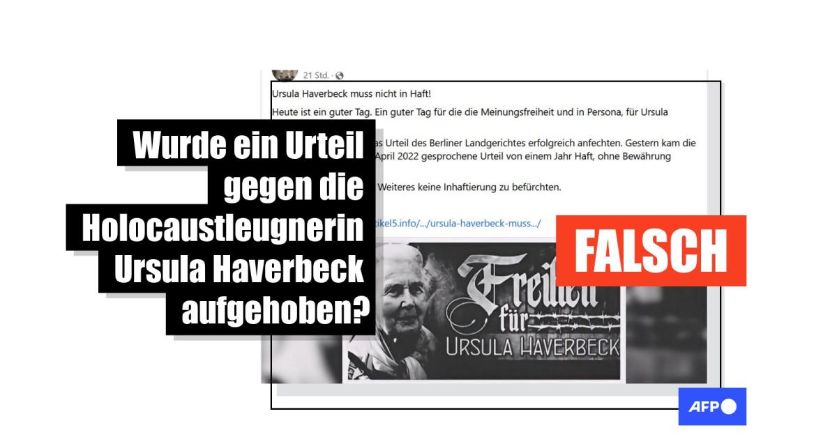 Die Behauptung: "Ursula Haverbeck muss nicht in Haft!", heißt es in dem aktuell geteilten Posting. Demnach habe Haverbeck das Urteil des Berliner Landgerichts aus dem April 2022 "erfolgreich anfechten" können, woraufhin es angeblich aufgehoben worden sei. "Ursula hat damit bis auf Weiteres keine Inhaftierung zu befürchten."