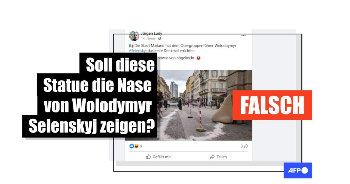 Die Behauptung: Online wird das Foto einer Nasen-Statue auf einer Straße geteilt. Davor ist eine Spur aus weißem Pulver zu sehen. User schreiben dazu: "Die Stadt Mailand hat dem Obergruppenführer Wolodoymyr #Selenskyj das erste Denkmal errichtet."