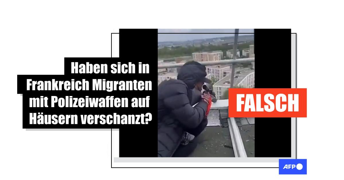 "In #Frankreich haben sich #Migranten mit gestohlenen Polizeiwaffen auf Häusern verschanzt", heißt es in einem Tweet vom 30. Juni 2023, der sich in sozialen Medien verbreitet. Das Posting zeigt einen Clip, in dem ein Mann auf dem Dach eines mehrstöckigen Gebäudes zu sehen ist. Er zielt mit einem Gewehr offenbar auf mehrere Personen neben einem Auto.