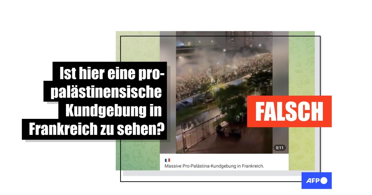Die aktuell geteilte Sequenz zeigt jedoch keinen pro-palästinensischen Protest in Frankreich. Durch eine Rückwärtssuche mit Ausschnitten aus dem Clip fand AFP das Video in einem Beitrag auf X, ehemals Twitter, des Profils "Planeta do Futebol" (zu Deutsch: Fußballplanet) vom 5. Oktober 2023 Ortszeit, also zwei Tage vor dem Großangriff der Hamas auf Israel. Die Beschreibung besagt, dass die Aufnahme Palmeiras-Fans auf dem Weg zum Stadion Allianz Parque in São Paulo zeigt.