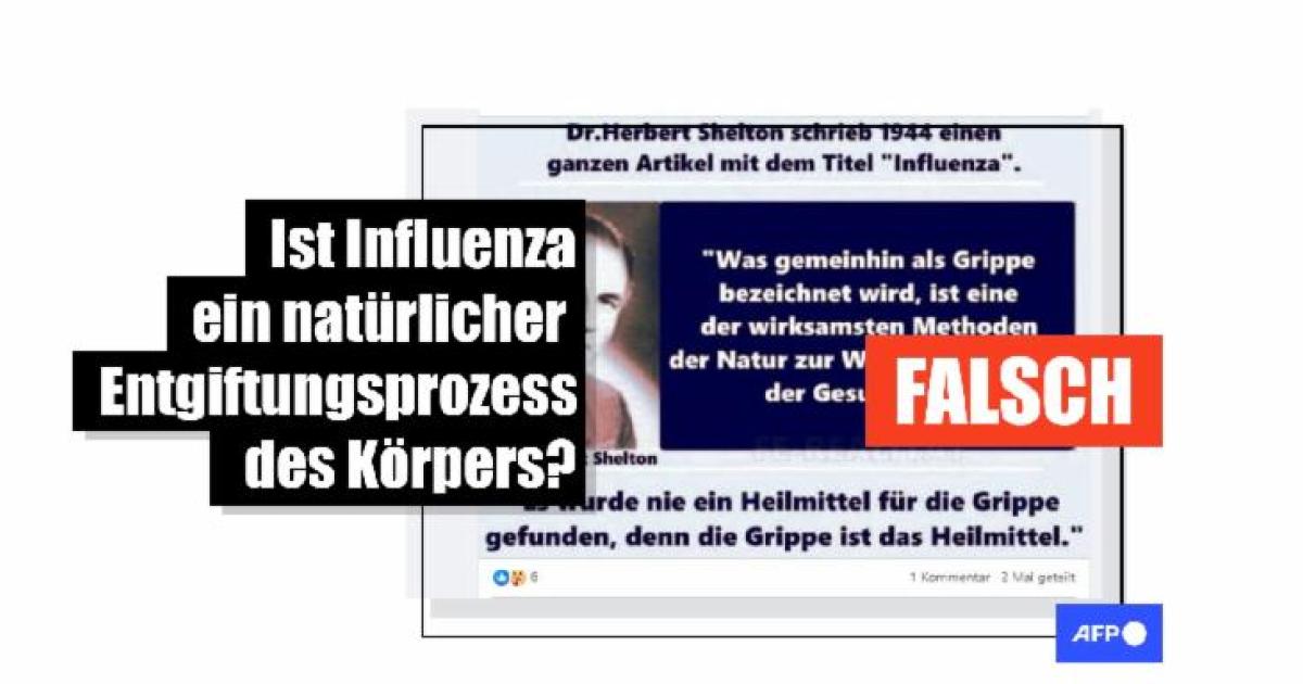 "Es wurde nie ein Heilmittel für die Grippe gefunden, denn die Grippe ist die Heilung", steht in deutscher Sprache etwa auf einem Bild, das seit Oktober 2023 auf Facebook geteilt wird. Grippe sei "eine der wirksamsten Methoden der Natur zur Wiederherstellung der Gesundheit", heißt es weiter. Beiträge mit demselben Text werden auch im Januar 2024 verbreitet. Grippe sei ein "Entgiftungsprozess" des Körpers, wird darin zudem behauptet. Die Postings schreiben die Aussagen "Dr. Herbert Shelton" zu und stammen angeblich aus einem Artikel aus dem Jahr 1944 mit dem Titel "Influenza".