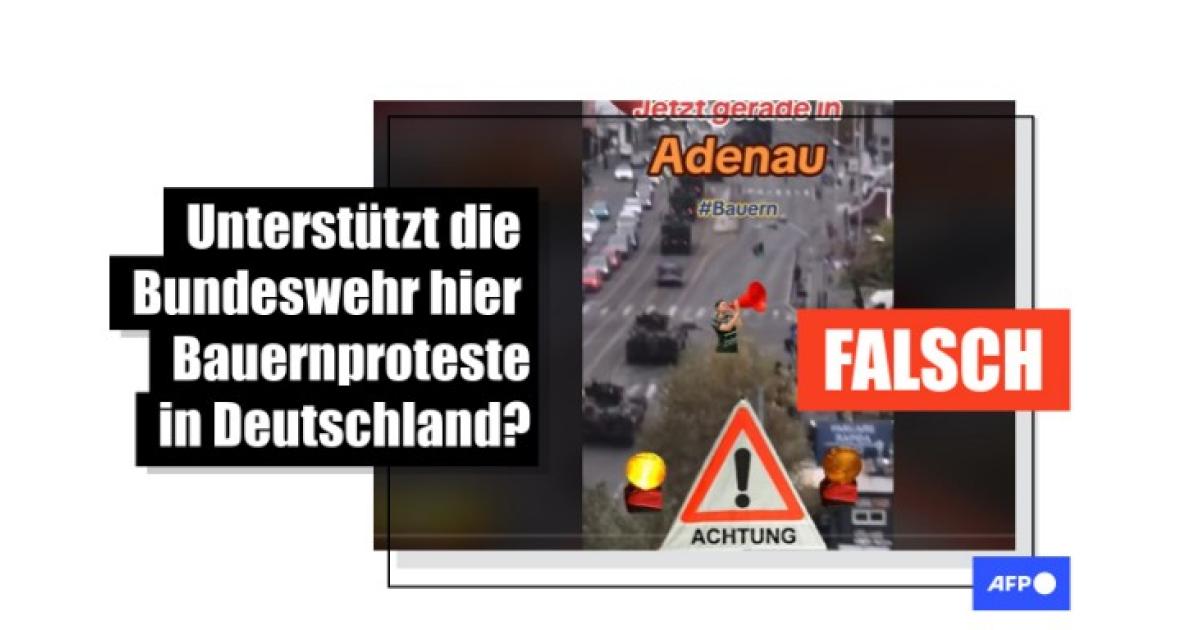 "Jetzt gerade in Adenau" und "#Bauern" heißt es in einem tausendfach auf Facebook verbreiteten Video. In dem Clip sind mehrere Panzer, die eine Straße entlang fahren, zu sehen. Die Szene spiele sich angeblich in der Stadt Adenau im deutschen Bundesland Rheinland-Pfalz am 13. Januar 2024 ab, heißt es im Clip. Es seien "tausende Uniformierte", die zur Unterstützung der Bauern nach Berlin fahren, zu sehen, wird weiter behauptet.
