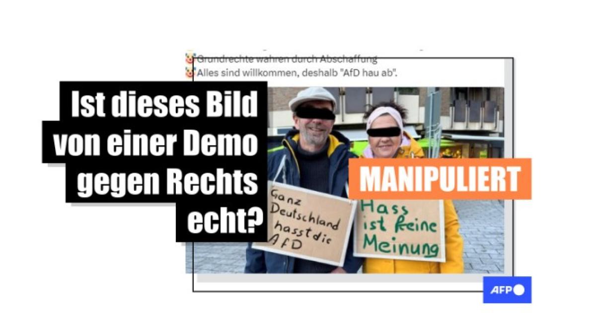 Durch eine umgekehrte Bildsuche stieß AFP auf einen Artikel der "Ruhr Nachrichten" vom 19. Januar 2024 über eine Demonstration gegen Rechts in Castrop-Rauxel am 18. Januar 2024. Ein Bild des Artikels zeigt eindeutig die beiden Personen, die auf dem Foto in den Beiträgen zu sehen sind. Als Urheberin ist die Autorin des Artikels angegeben.