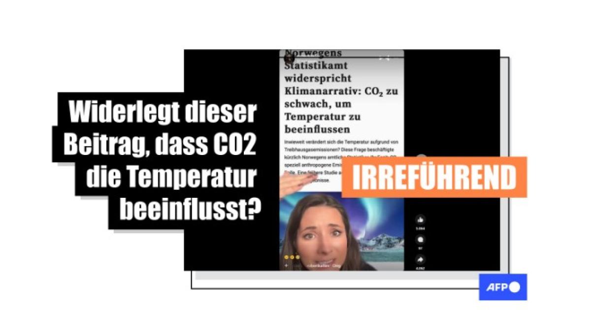 "Norwegens Statistikamt widerspricht Klimanarrativ: CO2 zu schwach, um Temperatur zu beeinflussen" ist in einem Video als Überschrift eines Artikels zu lesen. "Die Klimakrise ist aufgeflogen", kommentiert die Userin, die den Artikel in dem Clip bespricht, der seit dem 6. Februar 2024 über 4000 Mal auf Facebook geteilt wurde.