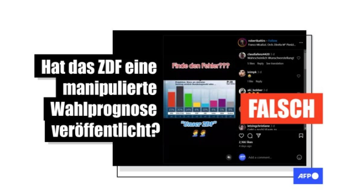 Fazit: Eine im Netz geteilten Wahlumfrage des ZDF wurde so nie ausgestrahlt. Das enthaltene Balkendiagramm wurde manipuliert. Die Manipulation bestätigte der Sender gegenüber AFP und ein Vergleich mit der Originalsendung bestätigte das.