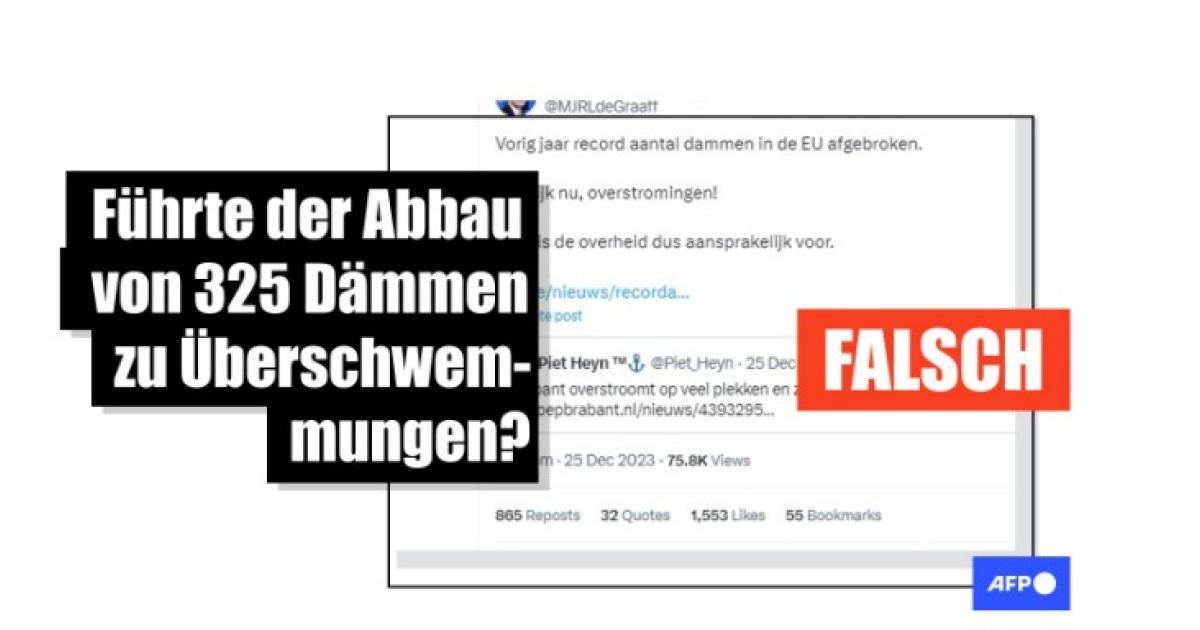 "Letztes Jahr wurde in der EU eine Rekordzahl von Dämmen abgerissen. Und jetzt – welch Überraschung – Hochwasser", heißt es in einem Beitrag auf X vom 25. Dezember 2023 von Marcel de Graaff (FvD), niederländischer Politiker und Mitglied des Europäischen Parlaments. De Graaff war bis Ende 2022 Mitglied der Rechtsaußen-Fraktion Identität und Demokratie (ID) im Europäischen Parlament, verließ diese aber, nachdem er sie beschuldigt hatte, "russlandfeindlich" zu sein – nun ist er fraktionslos. Sein Beitrag auf X wurde über 800 Mal geteilt. Ein Artikel auf NineforNews, traf ebenfalls auf viel Zustimmung in sozialen Medien und wurde auf Facebook über 600 Mal geteilt.