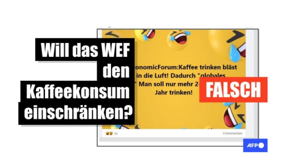 AFP führte eine Suche mit englischen Schlüsselwörtern wie "coffee" und "World Economic Forum" durch und stieß dabei auf einen Artikel, der am 22. Januar 2024 auf der US-amerikanischen Website The People's Voice veröffentlicht wurde. Der Titel des Artikels lautet übersetzt: "WEF erklärt dem Kaffee den Krieg: 'Nicht mehr als 2 oder 3 Tassen pro Jahr'".