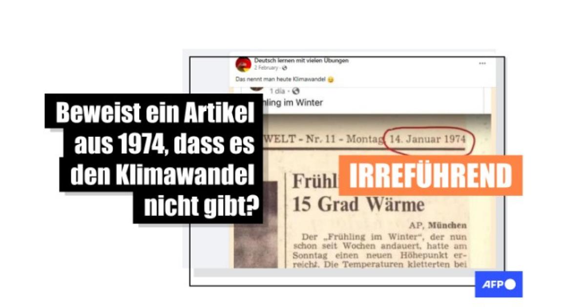"Das nennt man heute Klimawandel", heißt es in einem Facebook-Beitrag vom Februar 2024. Dazu wird ein Artikel der deutschen Tageszeitung "Die Welt" aus dem Jahr 1974 geteilt. "Frühling im Winter: 15 Grad Wärme", lautete der Titel. Dem Bericht zufolge wurden am 13. Januar 1974 im bayerischen Flachland Temperaturen von bis zu 15 Grad und auf der Zugspitze von null Grad gemessen. Skipisten in tieferen Lagen waren meist nicht mehr benutzbar, hieß es weiter.