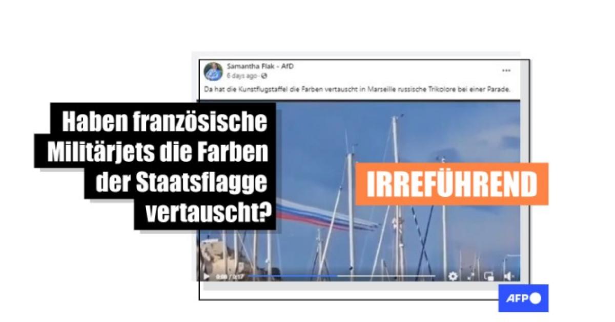 "Da hat die Kunstflugstaffel die Farben vertauscht in Marseille russische Trikolore bei einer Parade", schrieb eine AfD-Politikerin aus Schleswig-Holstein am 10. Mai 2024 auf Facebook und teilte ein Video. Das Video zeigt Düsenflugzeuge, die Rauch in roter, weißer und blauer Farbe in die Luft ausstoßen. Anstelle des französischen Blau-Weiß-Rot sieht man im Clip tatsächlich die Reihenfolge der russischen Flagge: Weiß-Blau-Rot.