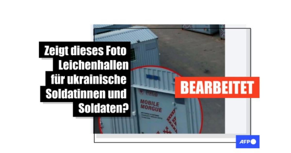 Das Foto zeigt jedoch keine mobilen Leichenhallen für getötete ukrainische Soldatinnen und Soldaten, wie in den Social-Media-Beiträgen fälschlicherweise behauptet wurde. AFP konnte das Originalfoto ausfindig machen. Dieses zeigt mobile Heizgeräte, die das ukrainische Rote Kreuz zusammen mit dem Getränkekonzern Coca-Cola für diesen Winter an Schulen und Krankenhäuser liefert. Der vergrößerte Ausschnitt auf dem Foto wurde digital hinzugefügt.