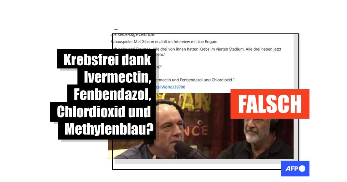 "Ich habe drei Freunde", sagte US-Schauspieler Mel Gibson dem konservativen US-amerikanischen Podcaster Joe Rogan im Gespräch: "Alle drei von ihnen hatten Krebs im vierten Stadium. Alle drei haben jetzt überhaupt keinen Krebs mehr." Daraufhin fragte Rogan, was sie genommen hatten. Es gehe um die Substanzen Ivermectin, Fenbendazol, Chlordioxid und Methylenblau, heißt es.