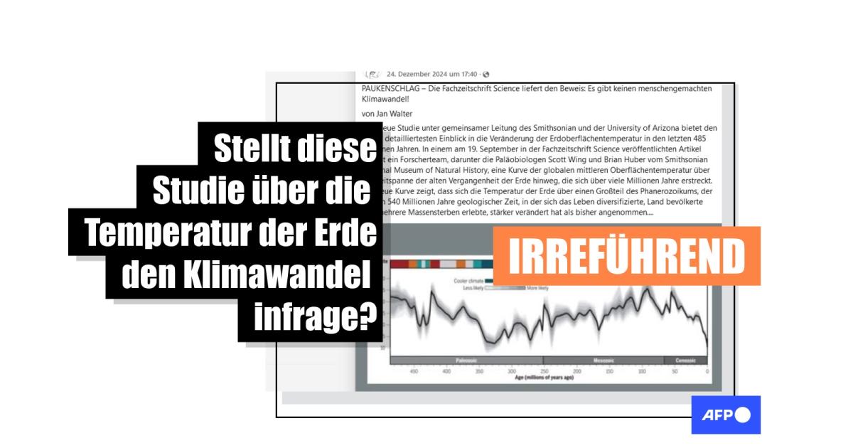 "PAUKENSCHLAG – Die Fachzeitschrift Science liefert den Beweis: Es gibt keinen menschengemachten Klimawandel!", war Ende Dezember 2024 in zahlreichen Beiträgen auf Facebook zu lesen. Dazu teilten Nutzerinnen und Nutzer einen Artikel der schweizerischen Verschwörungswebsite "legitim", der in der genannten Studie einen Beweis dafür sehen will, dass der Mensch nicht für den Klimawandel verantwortlich ist. Auch auf Französisch wird diese Behauptung verbreitet.