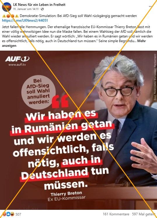 Am prominentesten verbreitete die Behauptung wohl X-Eigentümer Elon Musk: Auf seiner Plattform teilte der US-amerikanische Tech-Milliardär am 11. Januar 2025 einen Post mit einem Interviewausschnitt, in dem der ehemalige französische EU-Kommissar Thierry Breton über die Europäische Union, Rumänien und Deutschland spricht. Angeblich sage Breton darin, dass die EU die Bundestagswahl für ungültig erklären könnte, wenn die AfD als Sieger daraus hervorginge. Musk bezeichnete Breton in seinem Repost als "Tyrann von Europa".
