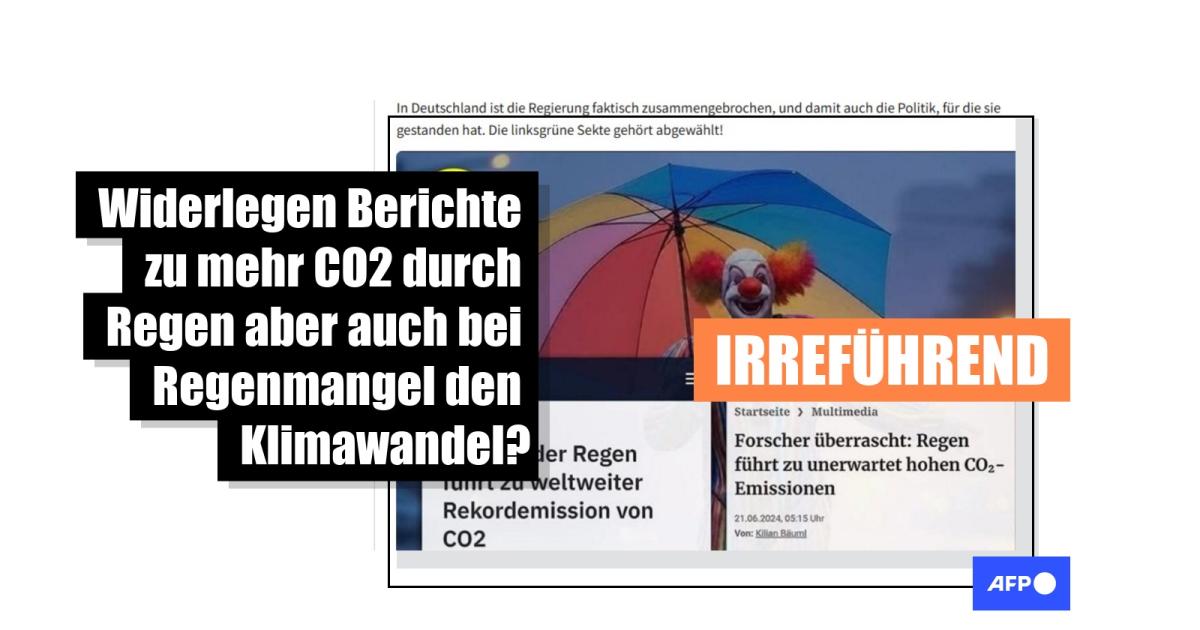 Zwei Berichte zur Auswirkung des Niederschlags in Form von Regen auf die Emissionen werden im Netz vielfach geteilt – allerdings zusammen mit einer Missinterpretation. "Regen führt zu hohen CO2-Emissionen, und mangelnder Regen führt auch zu hohen CO2-Emissionen", schrieb ein Nutzer im Juli 2024 auf Threads und teilte zwei Screenshots von Schlagzeilen zu Studienergebnissen. Die Behauptung kursiert aktuell erneut. "Klimawandel ist Quatsch!", hieß es in den Kommentaren eines Facebook-Beitrags vom 17. Januar 2025.
