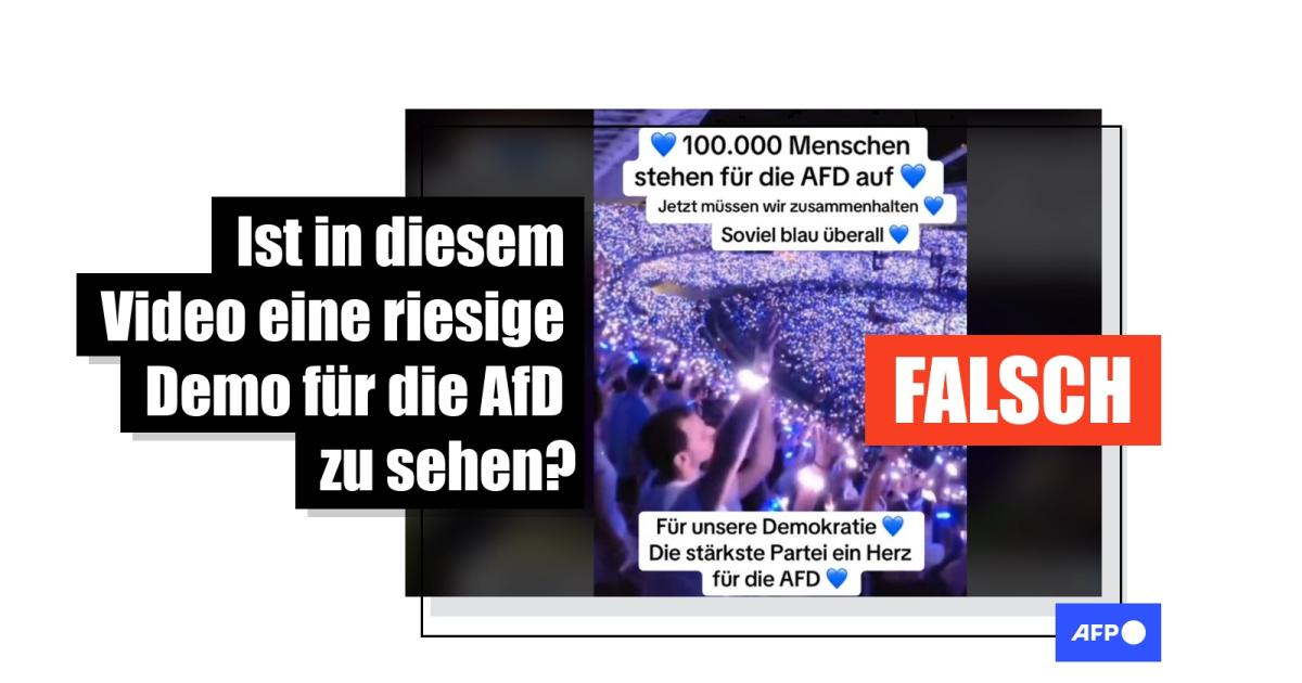 In den geteilten Videos sind in der Menschenmasse blaue Lichter zu sehen und die Personen tragen weiß leuchtende Armbänder. Eine Suche auf Tiktok führte zu einer längeren Version, in der zusätzlich zu diesem Clip eine Drohnenaufnahme eines Stadions und weitere Aufnahmen von feiernden Menschen vor einer Bühne zu sehen sind. Die meisten dieser Videos wurden von dem Tiktok-Account "alice_weidel_fan" verbreitet. Sie wurden jedoch vor Veröffentlichung dieses Faktenchecks gelöscht. Auf eine Bitte um Stellungnahme erhielt AFP bis zur Veröffentlichung keine Antwort.