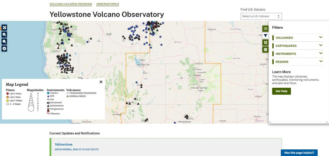 Zur seismischen und vulkanischen Lage in der Yellowstone-Region veröffentlicht der Geologische Dienst der Vereinigten Staaten (United States Geological Survey, USGS) monatliche Berichte auf seiner Website, die auf Analysen der seismischen Stationen der Universität von Utah basieren (hier und hier archiviert). Zwar wurden im Juni 2025 rund sechzig Erdbeben registriert, doch das stärkste erreichte lediglich eine Magnitude von 2,7 auf der Richterskala – ein messbares, an der Oberfläche aber nicht oder nur schwach spürbares Ereignis.