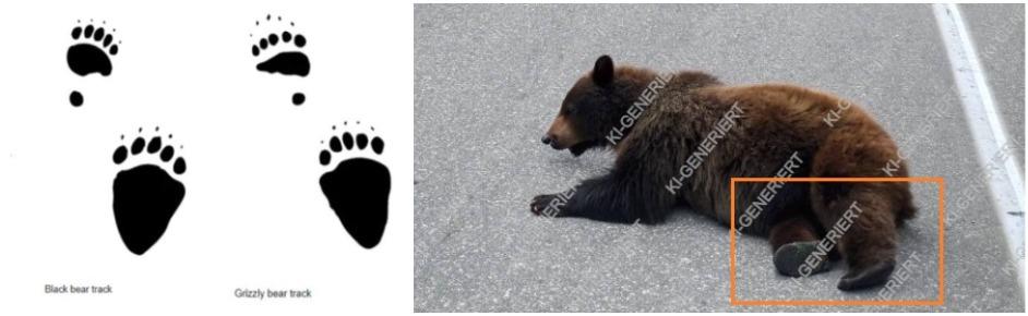 Das Bild ist von besserer Qualität als die Version in den aktuell geteilten Postings und verfügt über zahlreiche Elemente, die auf eine Erstellung mithilfe von KI hinweisen. Im Yellowstone-Nationalpark leben Grizzly- und Schwarzbären. Auf der Website des Nationalparks sind auch die typischen Pfotenabdrücke der Bären zu finden (hier archiviert). In dem in sozialen Medien verbreiteten Bild hat einer der Bären jedoch eine glatte, schuhsohlenähnliche Pfote ohne Krallen: