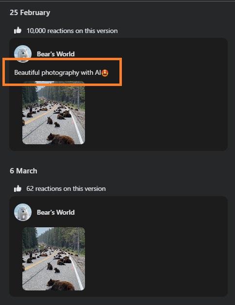 Wie auch Snopes in einem Faktencheck berichtete, lassen sich mit einer umgekehrten Bildsuche Varianten der Aufnahme bis zurück in den Februar 2025 finden – so wie ein Bild, das von der Facebook-Seite "Bear's Word" ("Die Welt der Bären") geteilt wurde und eine qualitativ hochwertigere Version des auf Deutsch verbreiteten Fotos darstellt. Die Seite veröffentlichte das Bild ursprünglich mit der Beschreibung "wunderschönes, mit künstlicher Intelligenz erzeugtes Bild", wie sich aus den Bearbeitungshistorien des Beitrags ergibt, löschte diese Beschreibung jedoch im März 2025 wieder.