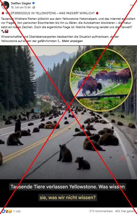 Dasselbe Bild sowie andere Bilder und Videos, die Tiere zeigen, verbreiteten sich zudem auf Französisch, wie AFP berichtete. Die falschen und irreführenden Behauptungen folgen alle einer ähnlichen Erzählung: Tiere würden in großer Zahl den Yellowstone-Nationalpark verlassen – einen der bekanntesten Nationalparks der Vereinigten Staaten –, weil eine Naturkatastrophe wie etwa ein Ausbruch des Vulkans in der Region drohe.