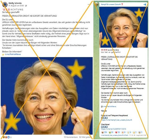 Vor "Verhaftungen, Sanktionierungen oder das Ausspähen von Daten missliebiger Journalisten" warnten mehrere Beiträge in sozialen Plattformen Mitte August 2025. Sowohl auf Facebook, als auch auf Instagram, Telegram sowie X behaupteten Userinnen und User irreführenderweise, "die EU unter Ursula von der Leyen" hätte nun ein Gesetz eingeführt, welches "nicht genehmen" Journalistinnen und Journalisten gefährlich werden könnte. Für Verhaftungen seien "keine Straftaten mehr nötig", diese könnten willkürlich durch ein "Allgemeininteresse" gerechtfertigt werden.