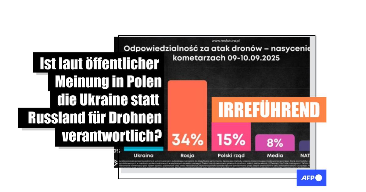 "Die Polen geben hauptsächlich der Ukraine die Schuld am Drohnenvorfall", schrieb ein Nutzer am 10. September 2025 auf Facebook. Laut dem Beitrag gaben 38 Prozent der Polinnen und Polen der Ukraine die Schuld an dem Drohnenvorfall in der Nacht zum 9. September 2025, nur 34 Prozent machten Russland verantwortlich. Das zeige eine "Analyse der Publikation Res Futura" zur "Verantwortung für das Eindringen der Drohnen auf polnisches Gebiet", hieß es.