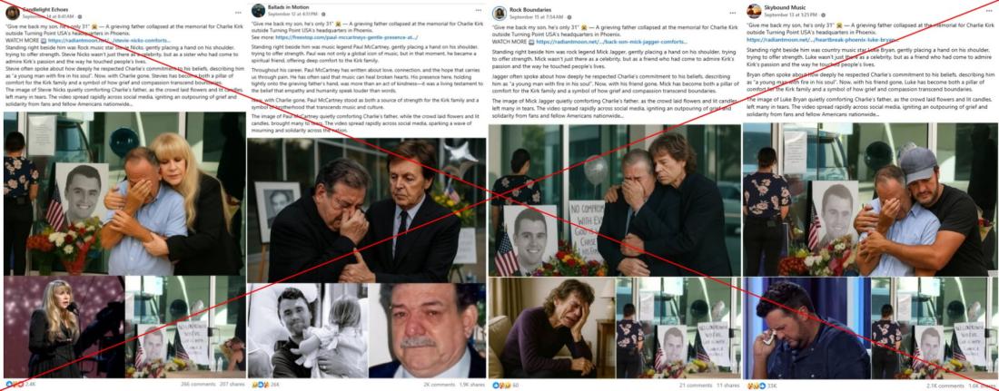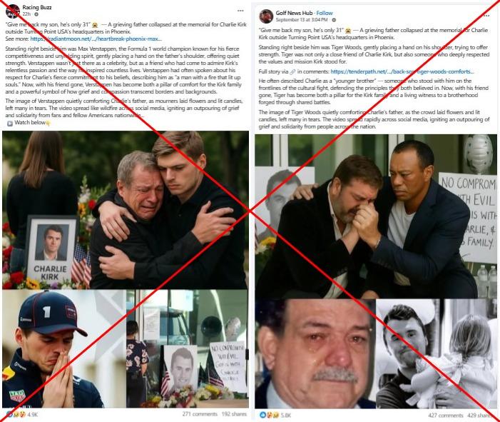 Die US-amerikanische Faktencheck-Organisation Lead Stories identifizierte weitere falsche Behauptungen über Sportstars, die Spenden an Kirks Familie geleistet hätten, die ebenfalls über Facebook-Seiten verbreitet wurden, die von Vietnam aus verwaltet werden. AFP berichtete im Juli 2025 über ähnliche Clickbait-Beiträge.