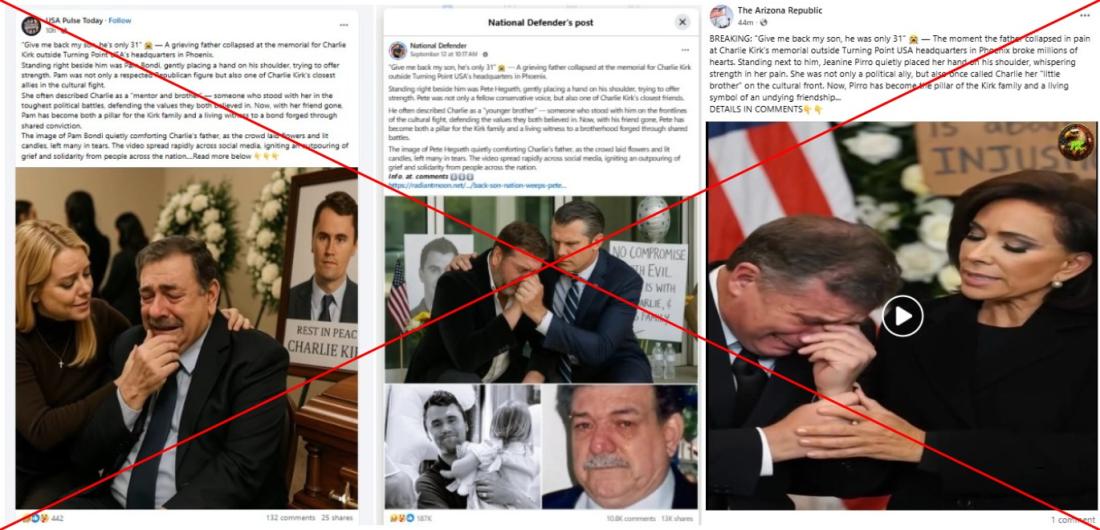 Fazit: Facebook-Behauptungen mit Fotos von Prominenten, die angeblich Charlie Kirks Vater trösteten, sind falsch. Sie basieren auf einem fremden Foto eines Nachrufs und stammen aus einem vietnamesischen Netzwerk, das gezielt Falschmeldungen verbreitet.