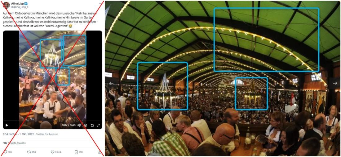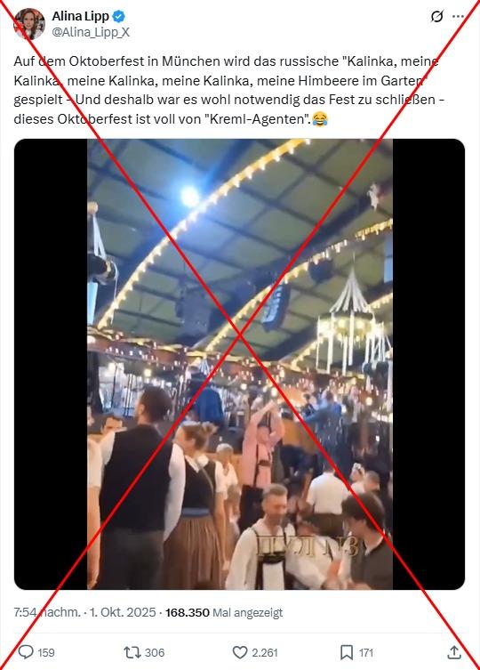 "Auf dem Oktoberfest in München wird das russische 'Kalinka, meine Kalinka, meine Kalinka, meine Kalinka, meine Himbeere im Garten' gespielt - Und deshalb war es wohl notwendig das Fest zu schließen - dieses Oktoberfest ist voll von 'Kreml-Agenten', schrieb Alina Lipp am 1. Oktober 2025 auf X. Dazu teilte die prorussischen Bloggerin, die von der Europäischen Union wegen "destabilisierenden Aktivitäten gegen die EU" sanktioniert wurde, ein Video von mehreren Menschen in Tracht, die in einem Festzelt lautstark bei dem russischen Volkslied "Kalinka" mitsingen und schunkeln.