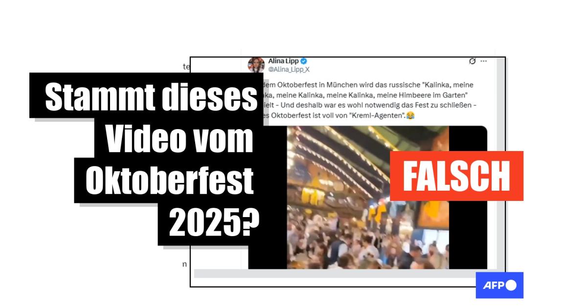 "Auf dem Oktoberfest in München wird das russische 'Kalinka, meine Kalinka, meine Kalinka, meine Kalinka, meine Himbeere im Garten' gespielt - Und deshalb war es wohl notwendig das Fest zu schließen - dieses Oktoberfest ist voll von 'Kreml-Agenten'", schrieb Alina Lipp am 1. Oktober 2025 auf X. Dazu teilte die prorussische Bloggerin, die von der Europäischen Union wegen "destabilisierenden Aktivitäten gegen die EU" sanktioniert wurde, ein Video von mehreren Menschen in Tracht, die in einem Festzelt lautstark bei dem russischen Volkslied "Kalinka" mitsingen und schunkeln.