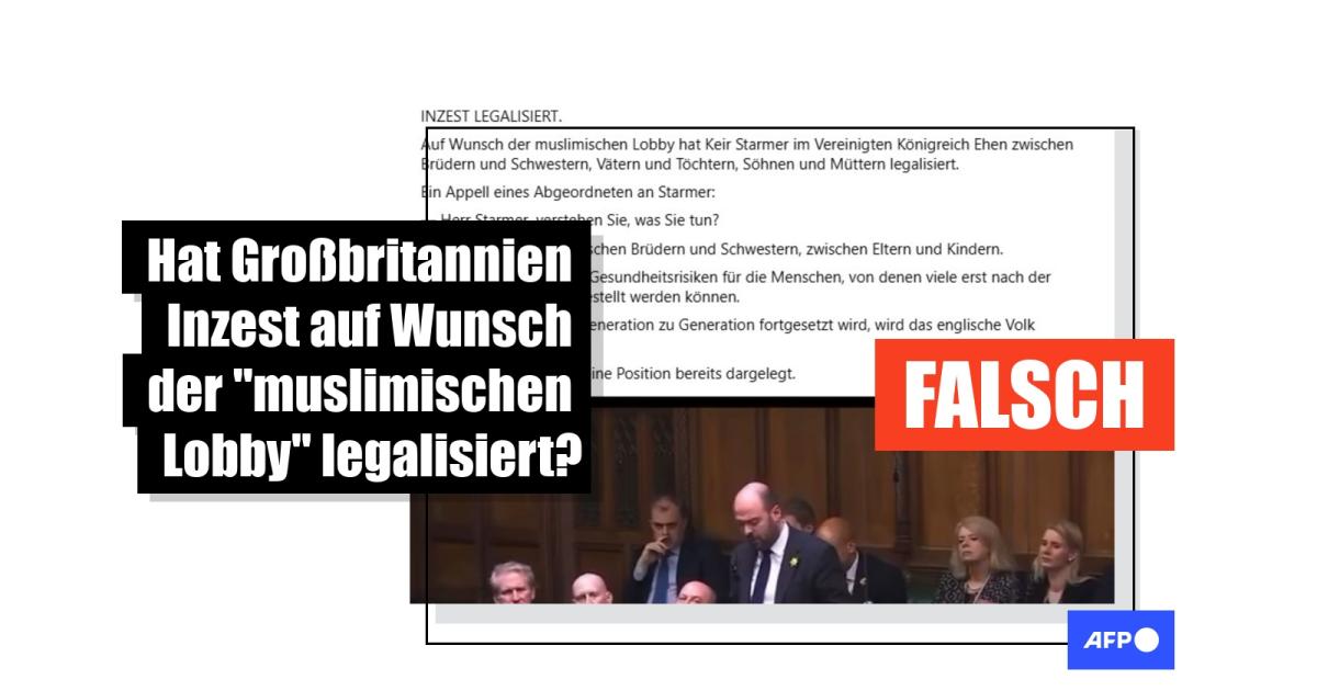 "Auf Wunsch der muslimischen Lobby hat Keir Starmer im Vereinigten Königreich Ehen zwischen Brüdern und Schwestern, Vätern und Töchtern, Söhnen und Müttern legalisiert", lautete eine Falschnachricht, die Anfang Oktober 2025 online mehrfach verbreitet wurde. Eine Facebook-Userin behauptete etwa am 4. Oktober 2025 in einem mehr als hundertfach geteilten Beitrag, dies bedeute "das Ende des Vereinigten Königreichs".