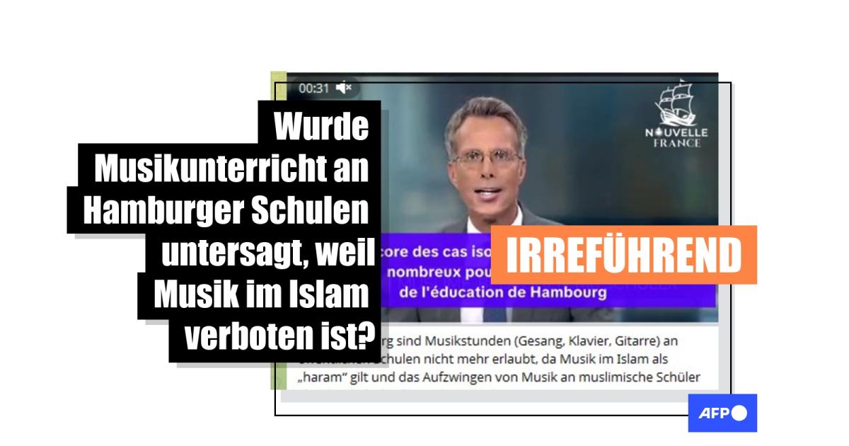 "In Hamburg sind Musikstunden (Gesang, Klavier, Gitarre) an öffentlichen Schulen nicht mehr erlaubt, da Musik im Islam als 'haram' gilt und das Aufzwingen von Musik an muslimische Schüler als Islamophobie betrachtet wird", heißt es in einem Telegram-Beitrag vom 1. Oktober 2025. Darin wurde ein Video verbreitet, in dem ein Nachrichtensprecher über Diskriminierung durch muslimische Schülerinnen und Schüler in Hamburg spricht und berichtet, dass einige nicht am Musikunterricht teilnehmen würden, weil dieser "haram", also dem islamischen Glauben zufolge verboten, ist.