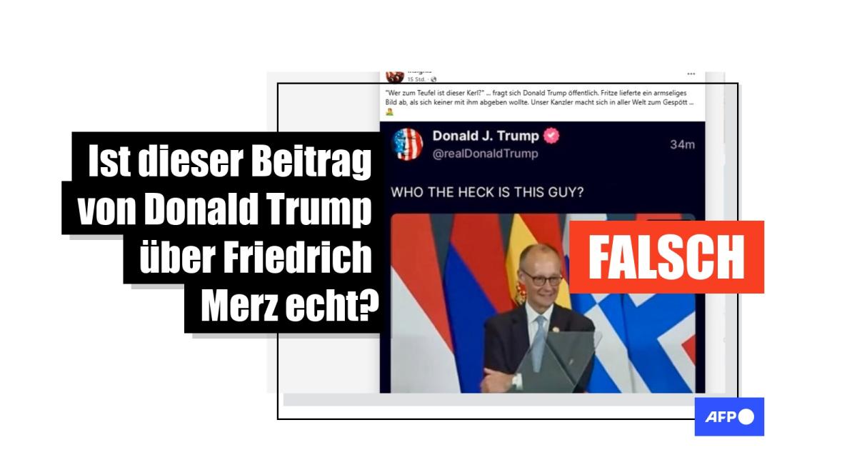 "'Wer zum Teufel ist dieser Kerl?' ... fragt sich Donald Trump öffentlich", heißt es in einem Facebook-Beitrag vom 14. Oktober 2025. Darin ist ein Screenshot zu sehen, der einen Post des US-Präsidenten Donald Trump auf seinem sozialen Netzwerk Truth Social darstellen soll. In diesem angeblichen Post ist ein Bild von Bundeskanzler Friedrich Merz (CDU) zu sehen, wie er vor großen aufgereihten Flaggen steht und die Arme vor der Brust verschränkt hat. Darüber soll Trump geschrieben haben "WHO THE HECK IS THIS GUY?", also etwa "Wer zur Hölle ist dieser Typ?".