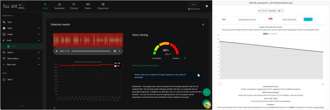 Mithilfe des Tools deepfake-total.com des Fraunhofer-Instituts für Angewandte und Integrierte Sicherheit konnte AFP bestätigen, dass die Audiospur des Videos, das sich online im falschen Kontext verbreitete, nachträglich bearbeitet wurde. Die Analyse ergab, dass die ursprüngliche Tonspur im Video mit einer Wahrscheinlichkeit von 81,3 Prozent durch eine von KI erstellte Spur ersetzt wurde.