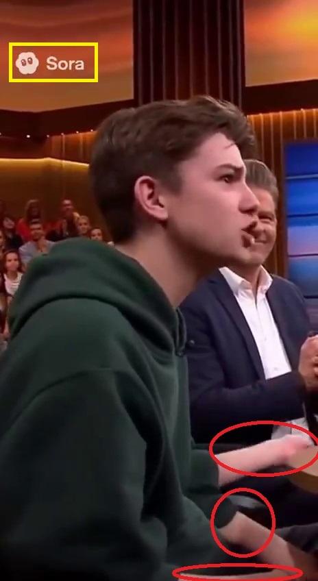 Abgesehen davon sind weitere Anhaltspunkte für eine KI-Erstellung deutlich im Clip zu erkennen. Für einige Sekunden gestikuliert der Junge scheinbar mit drei Armen. Wenn er redet, passt die Bewegung seines Mundes nicht zu den Muskelbewegungen in seinem Hals.