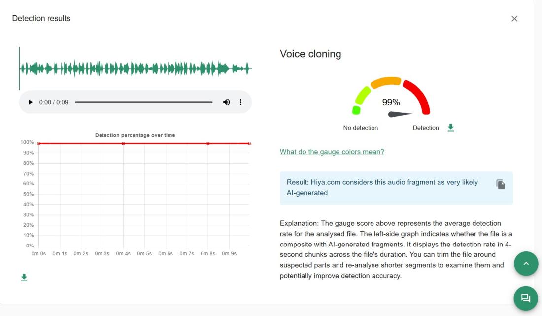 AFP überprüfte die Audiospur mithilfe der neuesten Entwicklerversion des Tools Hiya im Verifizierungstool InVID-WeVerify. Die Analyse ergab eine 99-prozentige Wahrscheinlichkeit, dass der Ton KI-generiert wurde.