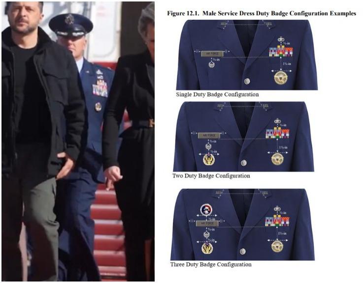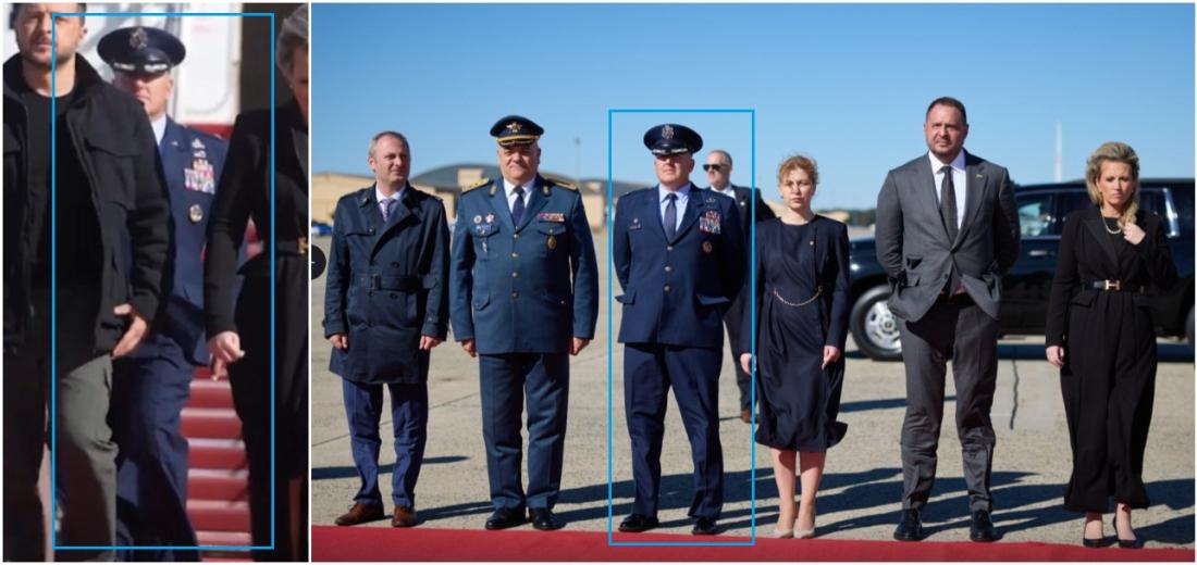 Neben ihr steht ein weiterer Vertreter, der Selenskyj begrüßt, ein Oberst der US-Luftwaffe, wie die AFP-Redaktion in Washington DC am 17. Oktober 2025 bestätigte. Derselbe Mann ist im Video hinter Selenskyj und auch auf einem Foto aus dem Büro des ukrainischen Präsidenten zu sehen: