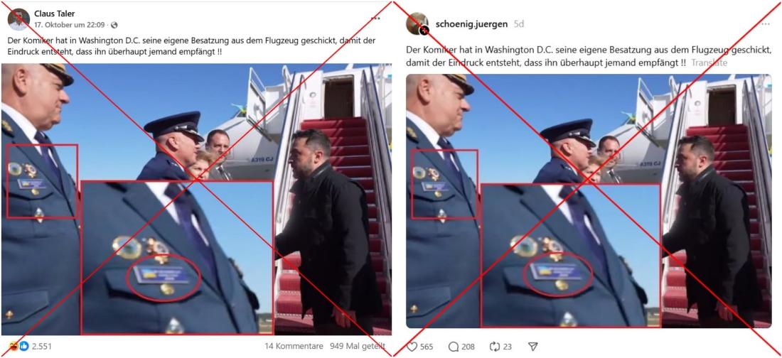 "Der Komiker hat in Washington D. C. seine eigene Besatzung aus dem Flugzeug geschickt", lautete ein fast tausendfach geteilter Facebook-Beitrag. Wolodymyr Selenskyj wird online häufig als Komiker bezeichnet – eine Referenz zu seiner Zeit als Schauspieler. Auf einem dazu kursierenden Bild ist der ukrainische Präsident in schwarzer Jacke gekleidet vor einem Flugzeug zu sehen. Er begrüßt mehrere Personen, darunter befindet sich ein Mann, der mehrere Abzeichen trägt. Eines zeigt die ukrainische gelb-blaue Flagge. Diese Szene solle den Eindruck erwecken, Selenskyj habe sein Personal vorgeschickt, damit "ihn überhaupt jemand empfängt", mutmaßten Userinnen und User online.